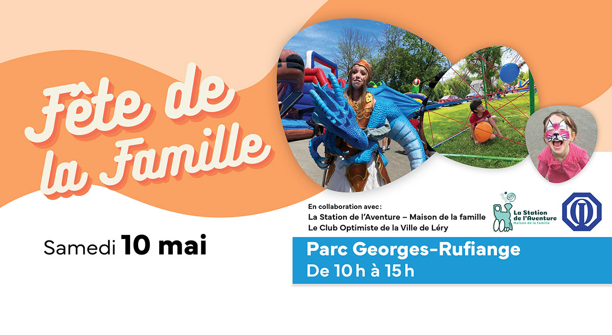 La Fête de la famille, organisée de concert avec la Station de l’Aventure — Maison de la famille ainsi que le Club Optimiste de la Ville de Léry aura lieu le samedi 10 mai prochain, de 10 h à 15 h, au parc Georges-Rufiange.
